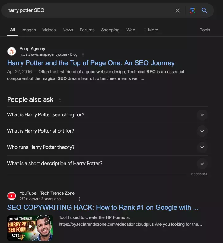 只是为了好玩,如果你在 Google 上搜索“哈利波特 SEO ”,就会发生以下情况: