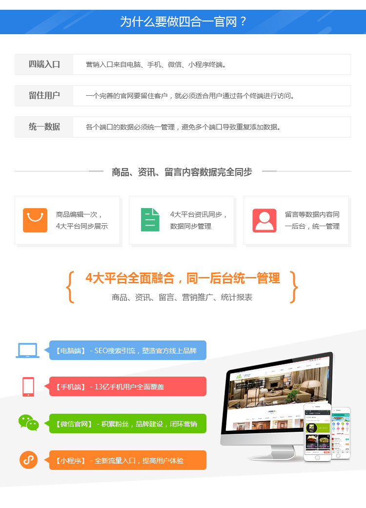 【网罗天下】H5建站四合一针对企业官网多终端访问设备和多种系统并存、用户流失、成本太高和维护麻烦的问题,帮助企业快速建立精美,有效的官网。主要特点01.所见即所得的在线自助H5建站产品02.无需懂技术代码03.无需租用空间04.一键开通完善、智能的系统05.轻松快速创建企业的官网06.整站内置SEO搜索引擎优化机制
